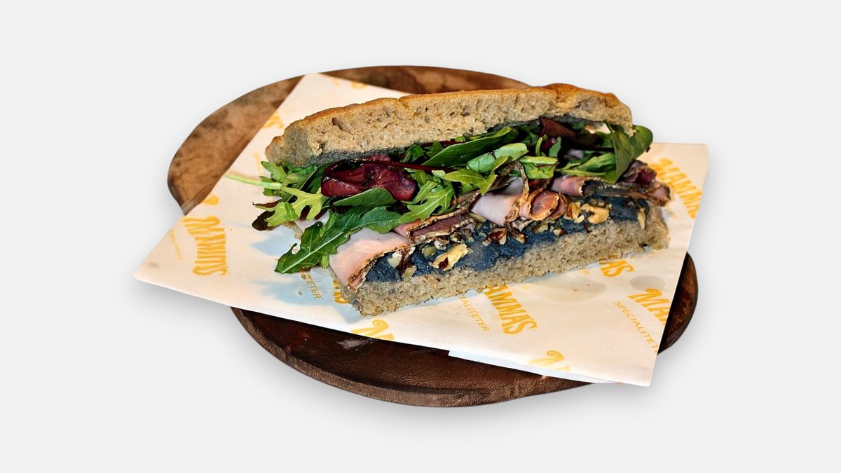 Brød med fyld af rosmarinskinke, gedeostcreme, honning, valnødder og mix salat.