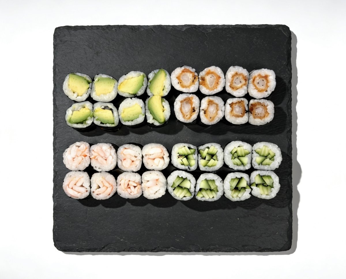 5 stk. Futomaki laks med avocado og agurk, 5 stk. Futomaki surimi med avocado og agurk, 8 stk. Uramaki laks med avocado og agurk, 8 stk. Uramaki tempurareje med avocado og agurk, 8 stk. Uramaki surimi med avocado og agurk.