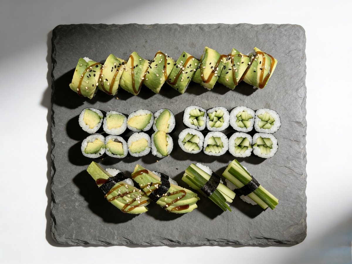 8 stk. Vegetar Kaburimaki, 8 stk. Hosmak med agurk, 8 stk. Hosmak med avokado, 2 stk. Nigiri med agurk, 2 stk. Nigiri med avokado.