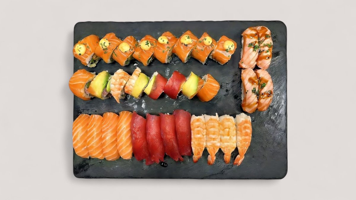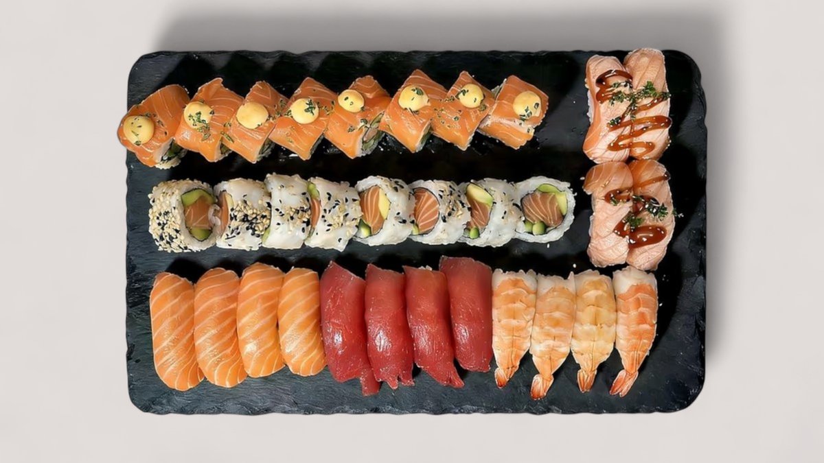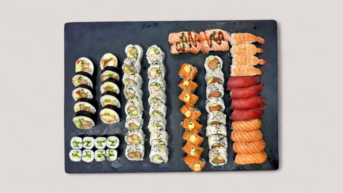 8 stk. Hosomaki agurk, 5 stk. Futomaki tempurareje med avocado, agurk og masago, 5 stk. Futomaki indbagt kylling med agurk, 8 stk. Uramaki tempurareje med avocado og agurk, 8 stk. surimi med avocado og agurk, 8 stk. Kaburimaki tempurareje med avocado og agurk, toppet med laks og chilimayonnaise, 8 stk. Uramaki laks med avocado og agurk, 4 stk. Nigiri laks, 4 stk. Nigiri tun, 4 stk. Nigiri reje, 4 stk. Nigiri flammegrillet laks med teriyaki sauce og forårsløg.