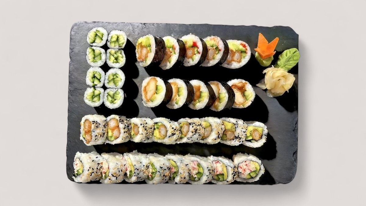 8 stk. Hosomaki agurk, 5 stk. Futomaki tempurareje med avocado, agurk og masago, 5 stk. Futomaki indbagt kylling med agurk, 8 stk. Uramaki tempurareje med avocado og agurk, 8 stk. surimi med avocado og agurk.