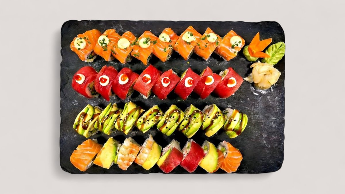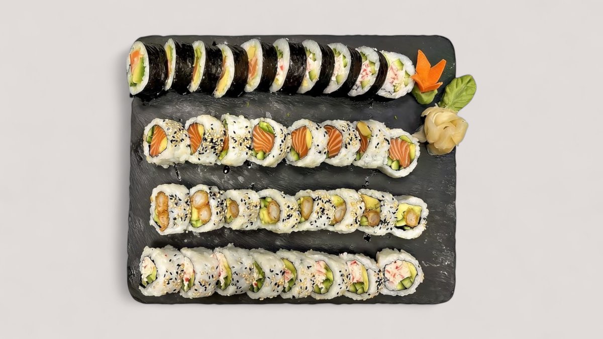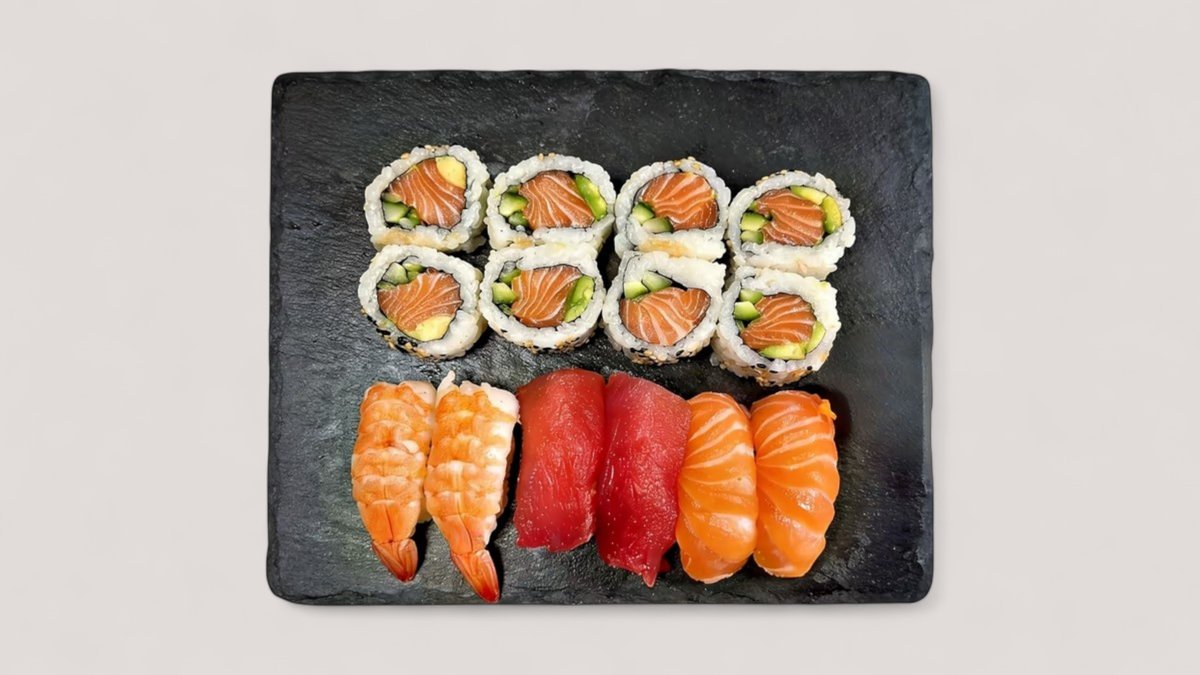 5 stk. Futomaki laks med avocado og agurk, 5 stk. Futomaki surimi med avocado og agurk, 8 stk. Uramaki laks med avocado og agurk, 8 stk. Uramaki tempurareje med avocado og agurk, 8 stk. Uramaki surimi med avocado og agurk, 8 stk. Kaburimaki tempurareje med avocado og agurk, toppet med laks og chilimayonnaise, 8 stk. Kaburimaki Regnbue med tempurareje eller surimi og avocado, toppet med laks, reje, tun og avocado. 4 stk. Nigiri laks, 4 stk. Nigiri tun, 4 stk. Nigiri reje, 4 stk. Nigiri flammegrillet laks med teriyaki sauce og forårsløg.