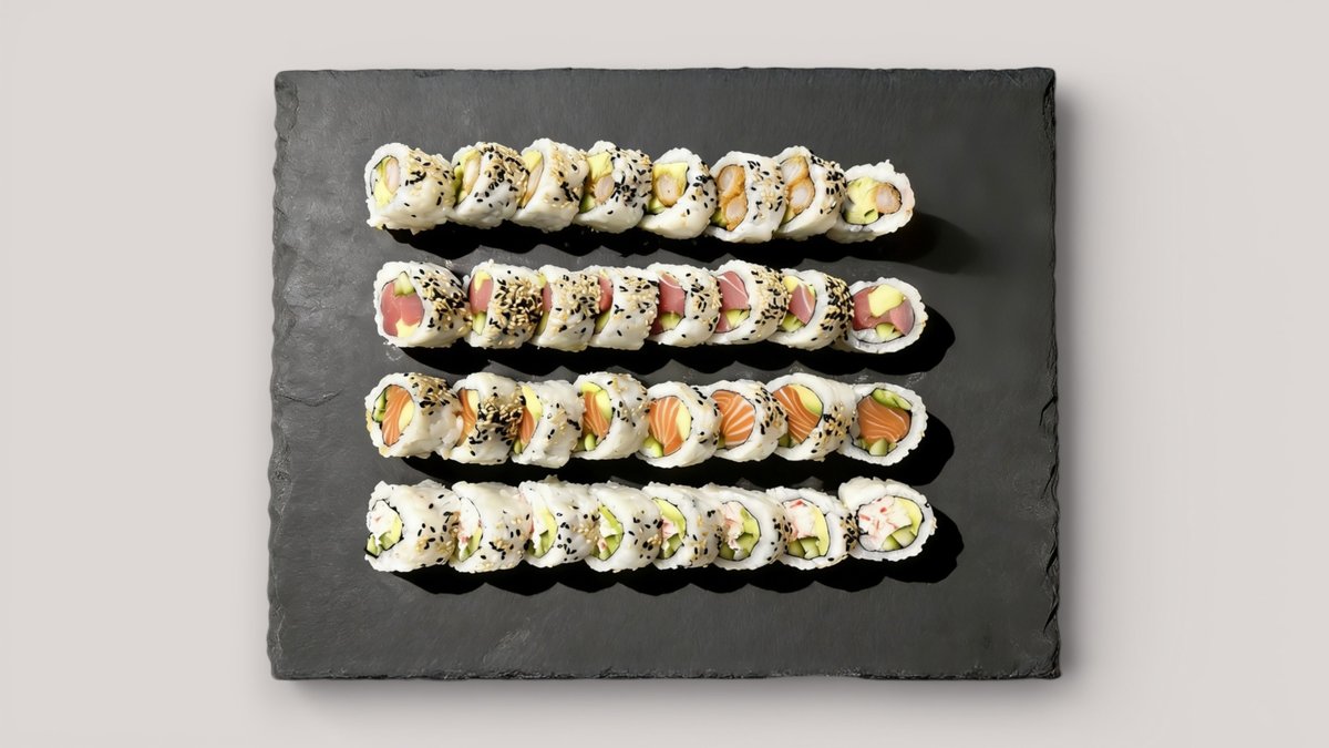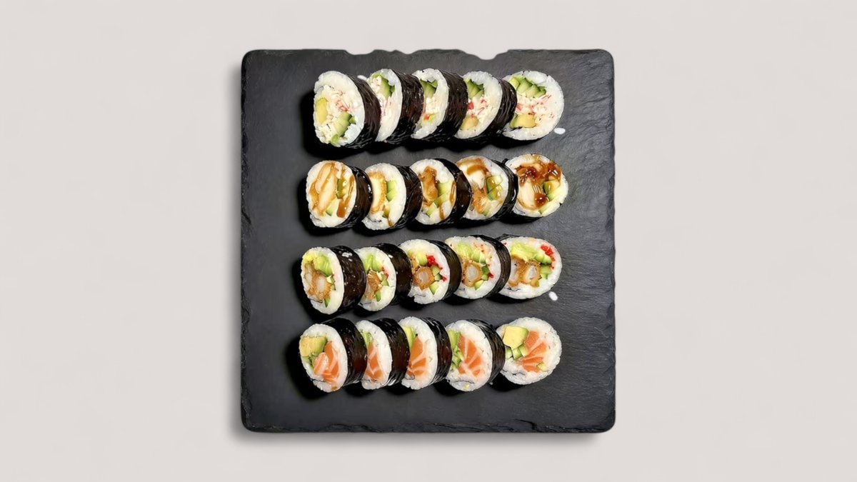 8 stk. Uramaki tempurareje med avocado og agurk, 8 stk. Uramaki tun med avocado og agurk, 8 stk. Uramaki laks med avocado og agurk, 8 stk. Uramaki surimi med avocado og agurk.