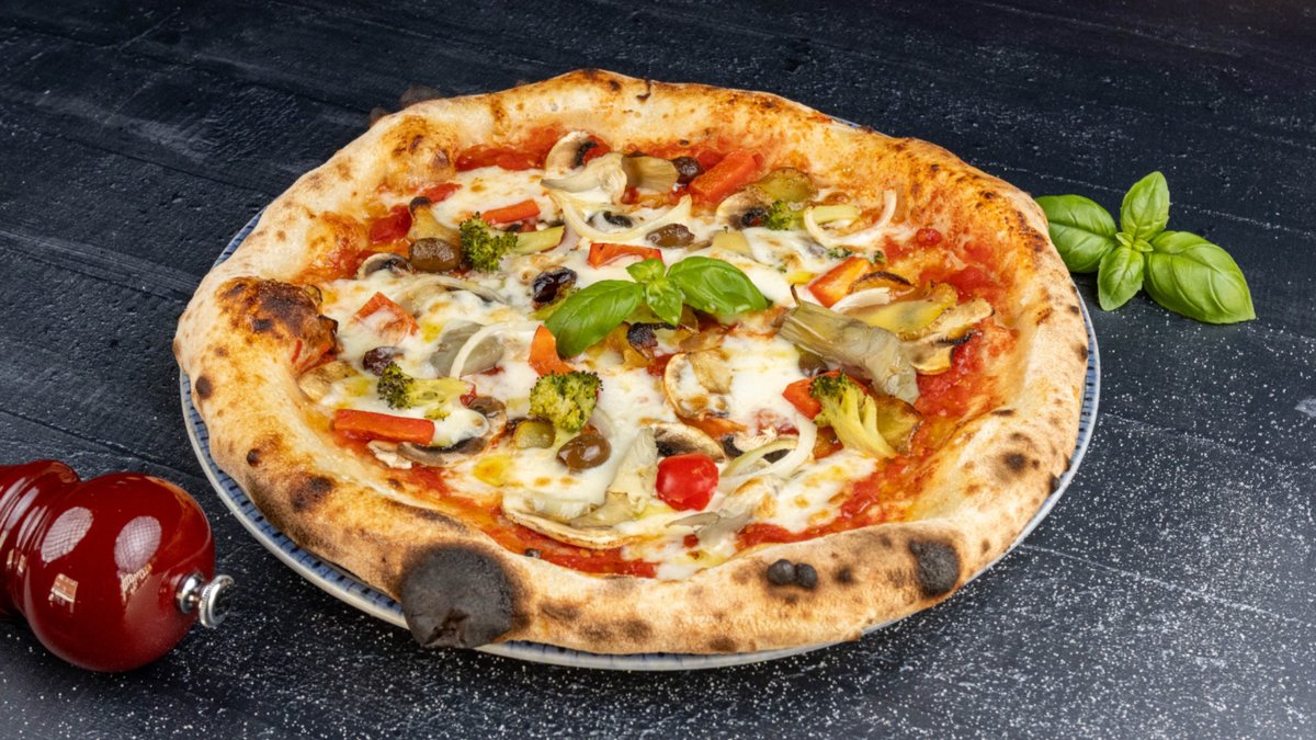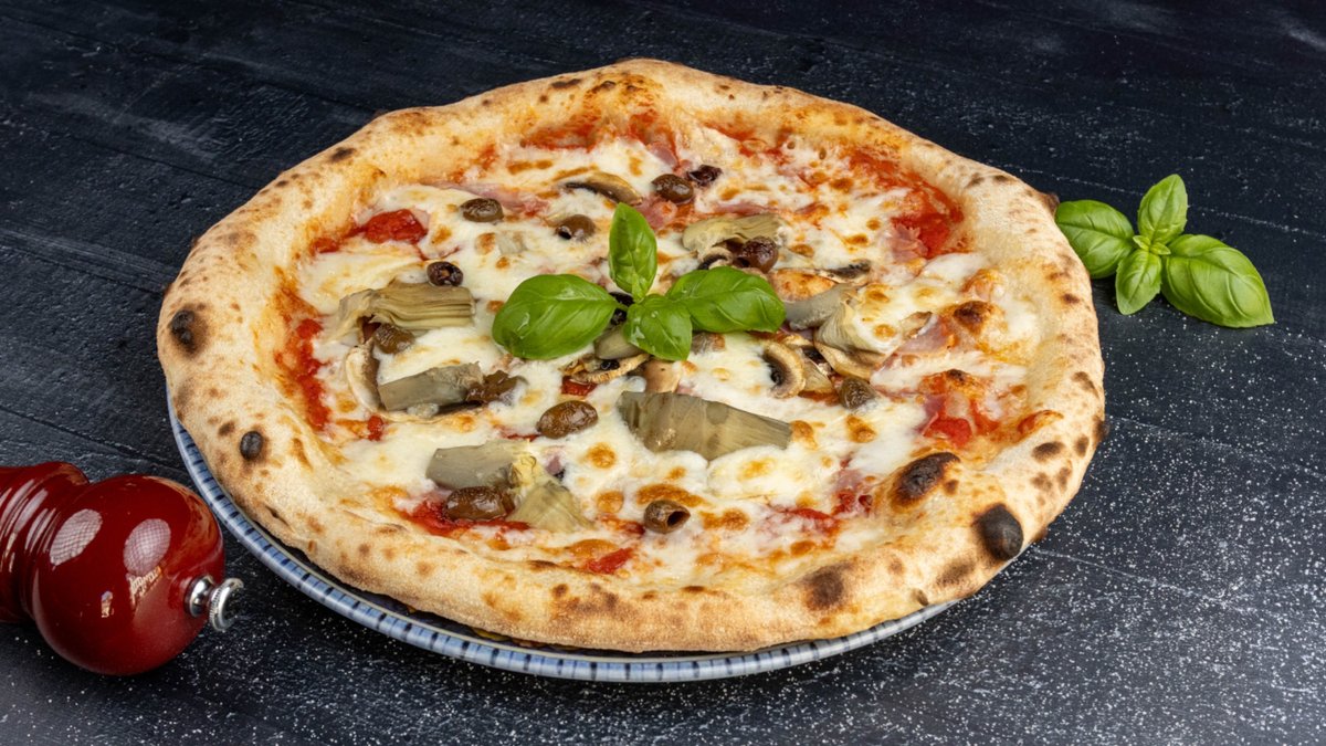 Tomat, Mozzarella, Pecorino Romano, Skinke, Svampe, Artiskokker, Oliven, Frisk Basilikum, Ekstra Jomfru Olivenolie