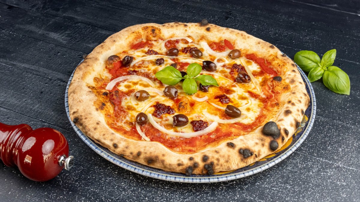 Tomat, Mozzarella, Pecorino Romano, Ventricina & Nduja (Italienske stærk salami), Løg, Sorte Oliven, Frisk basilikum, Ekstra Jomfru Olivenolie