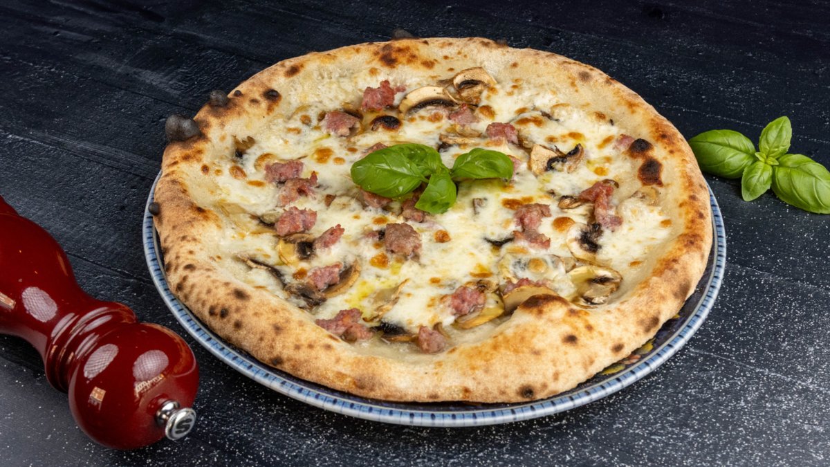 Mozzarella, Pecorino Romano, Svampe, Italiensk Pølse, Frisk Basilikum, Ekstra Jomfru Olivenolie