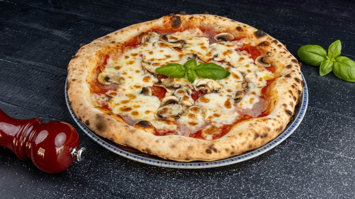 Tomat, Mozzarella, Pecorino Romano, Italiensk Kogt Skinke, Champignon, Frisk Basilikum, Ekstra Jomfru Olivenolie