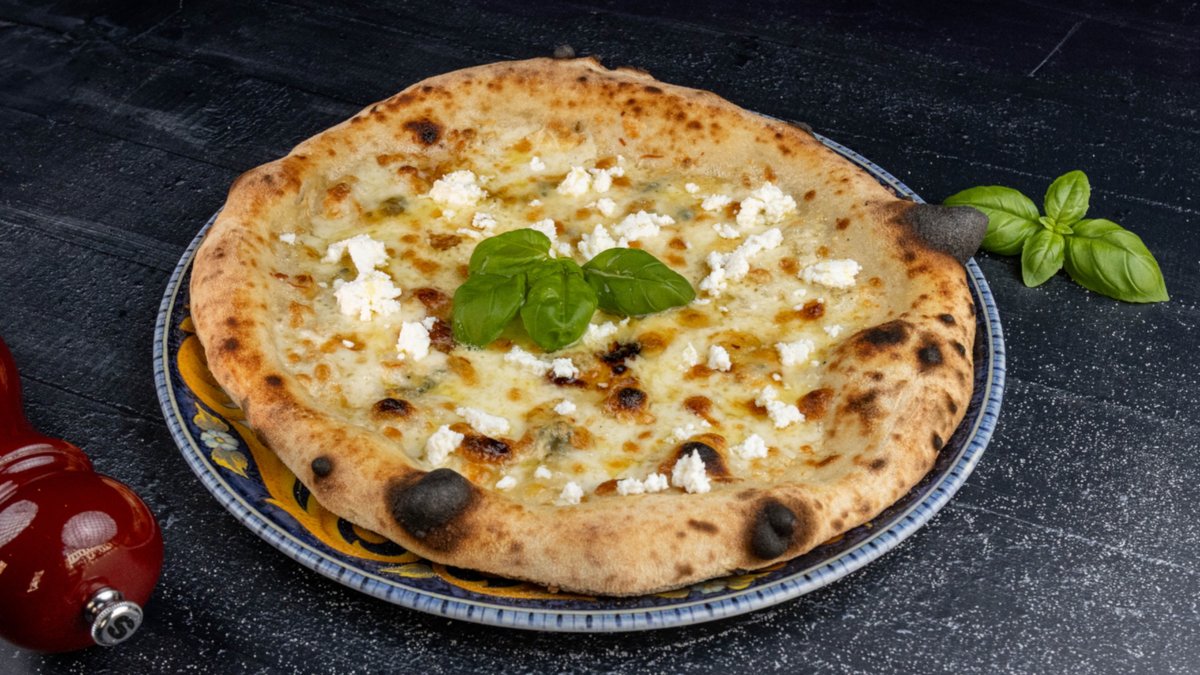 Mozzarella, Pecorino Romano, Gorgonzola, Ricotta (ost), Frisk Basilikum, Ekstra Jomfru Olivenolie