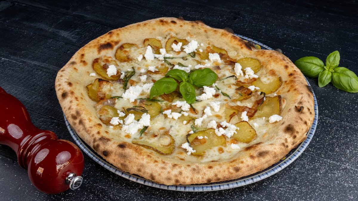 Ricotta (ost), Pecorino Romano, Kartoffelskiver, Italiensk Bacon, Rosmarin, Frisk Basilikum, Ekstra Jomfru Olivenolie