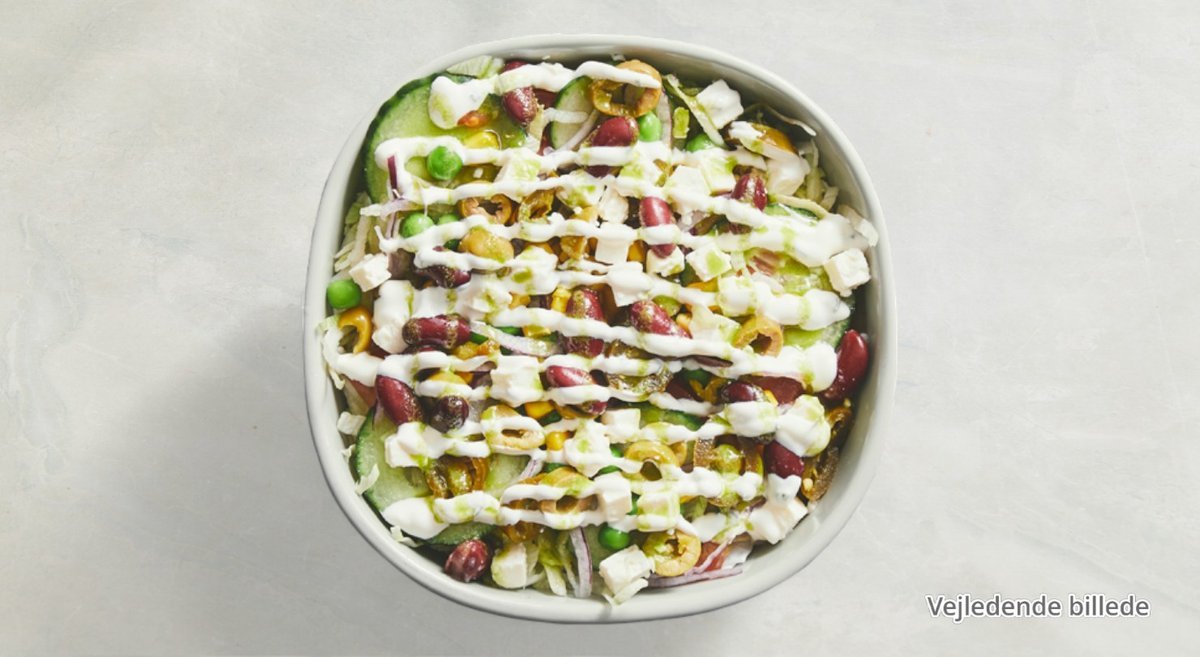 Salat bestående af tomatskiver, agurk, feta-ost, oliven, salat og dressing.