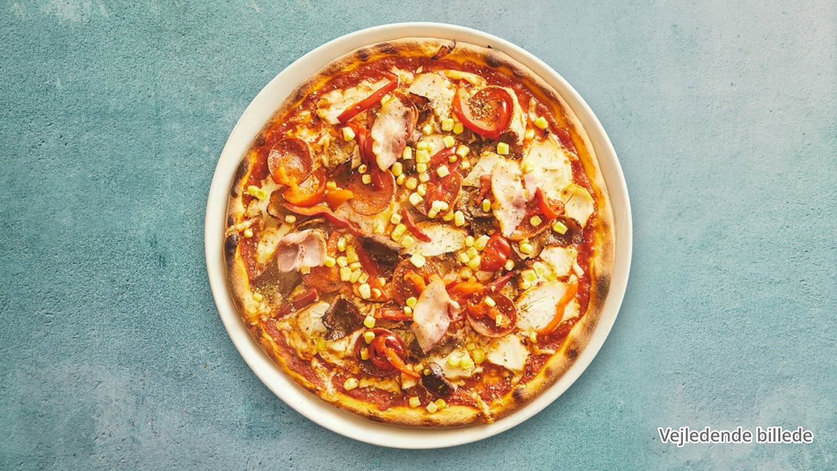Tomatsauce, ost, champignon, kylling, grøn peber, majs, karry og oregano.