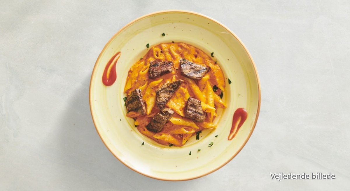 Penne vendt med oksekødssauce, fløde, tomat, champignon, ærter og parmesan-ost serveret med brød.