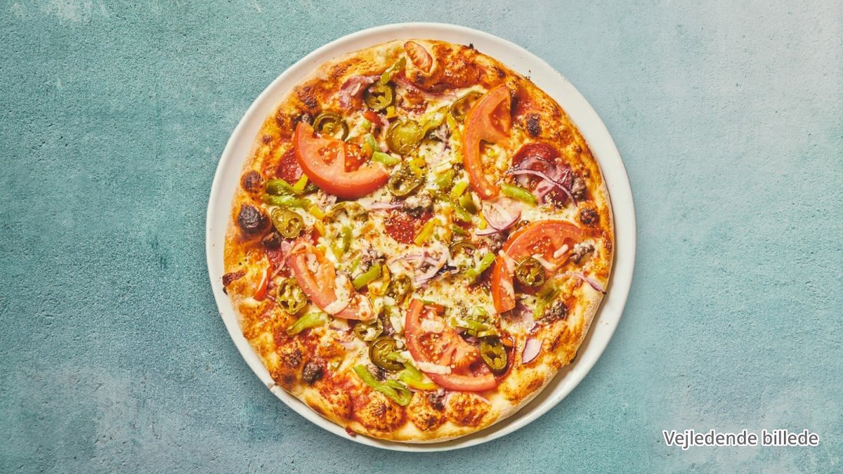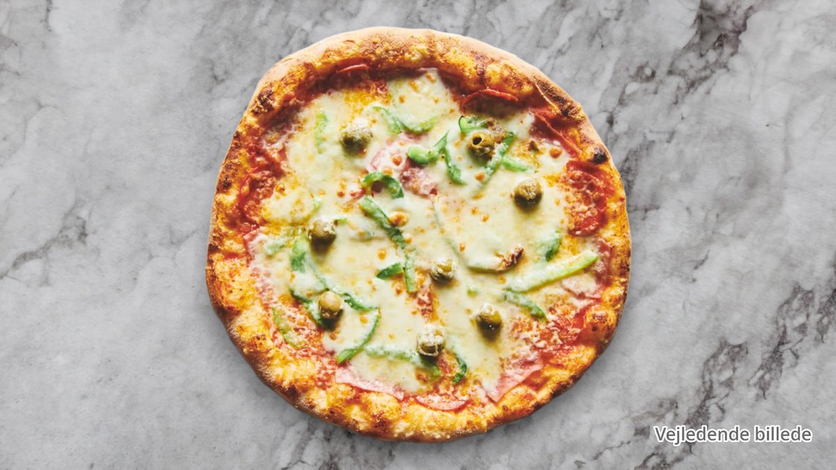 Tomatsauce, ost og 10 valgfri toppings (Skrives i kommentarfeltet).