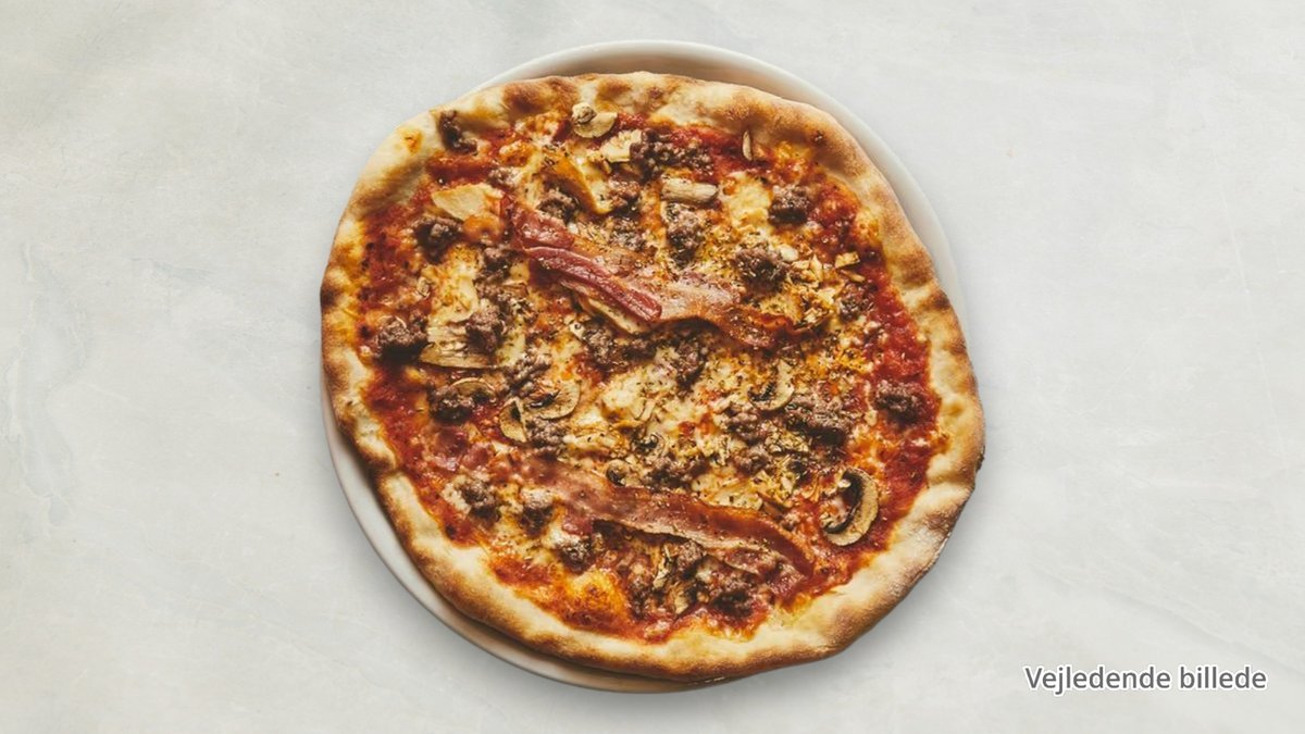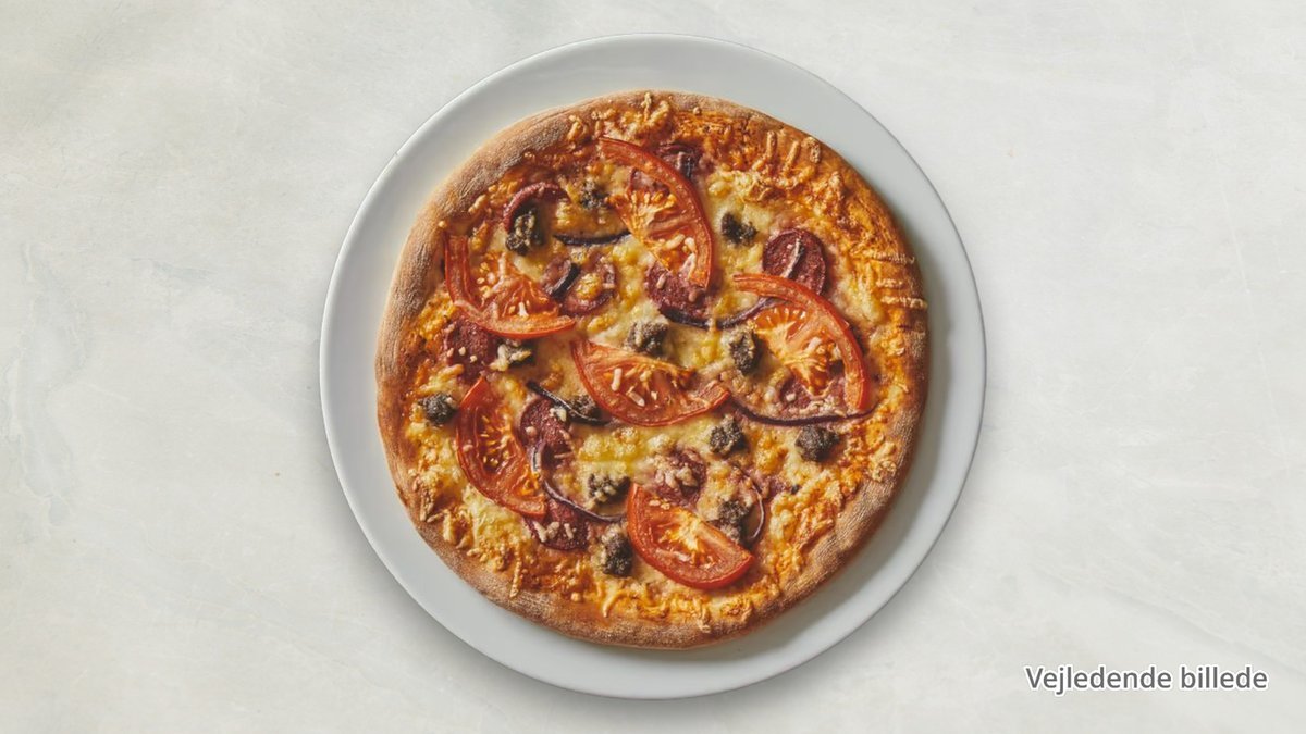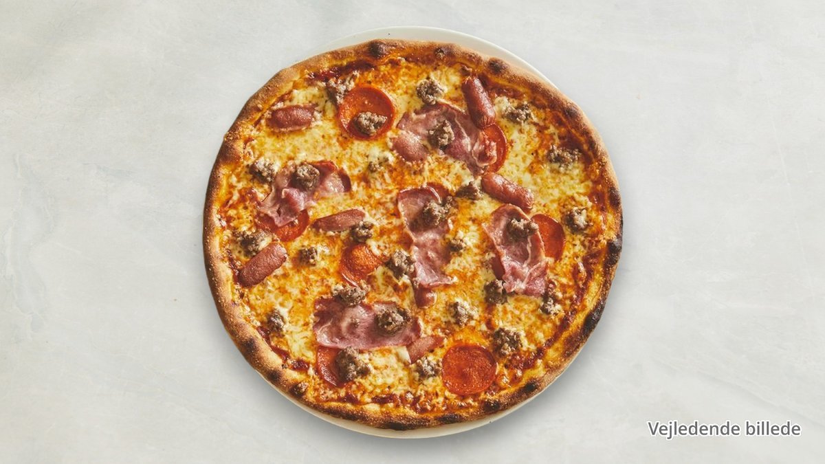 Tomatsauce, ost, kalveskinke, oksekød og kalvebacon.
