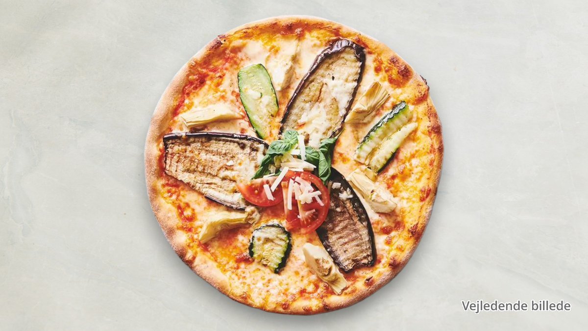Tomatsauce, ost, løg, champignon, oliven, paprika og artiskok.