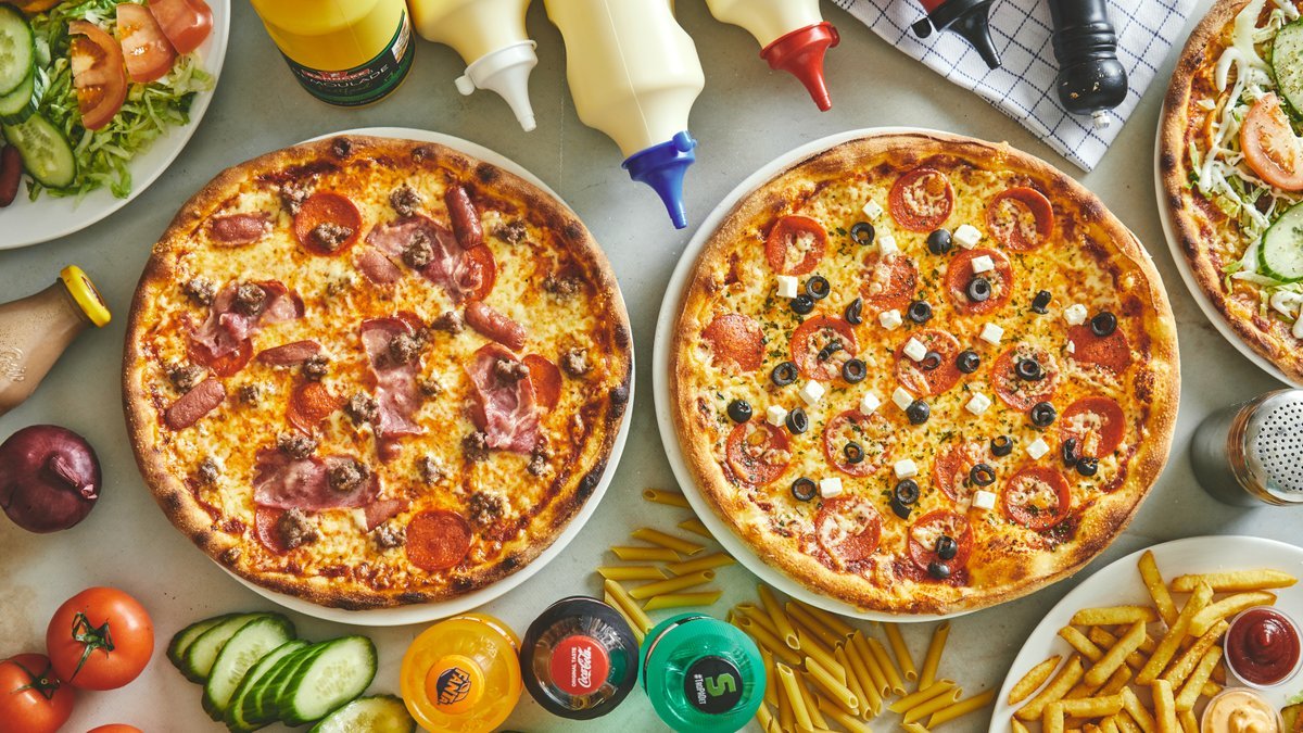 Tomatsauce, ost, kebab, kalvepepperoni, kyllingefilet, kalvepølser, salat, tomatskiver, agurk og dressing.