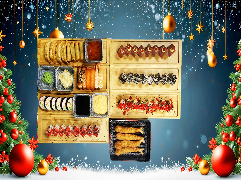 Uramaki: 8 x hells kitchen 8 x flamme dragon 8 x Tataki tun Futomaki: 10 x laks big 10 x ebi tempura 10 x california big