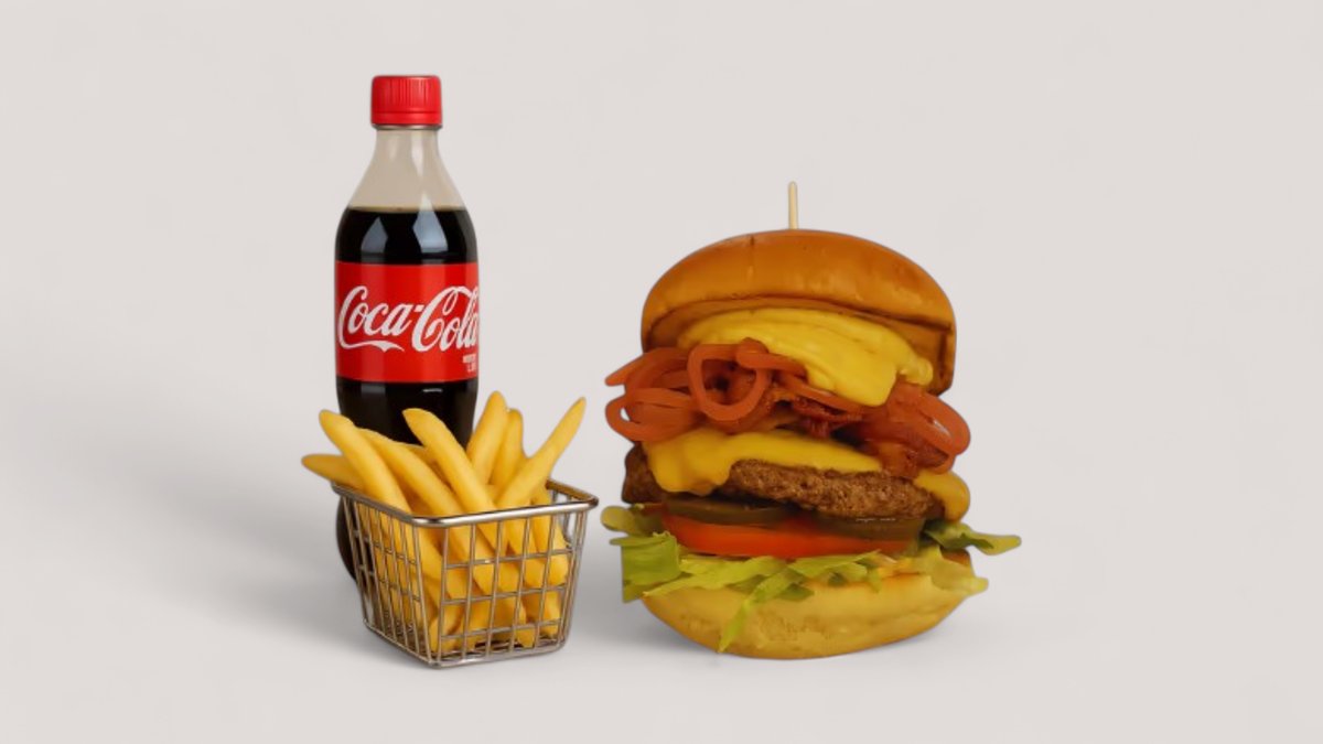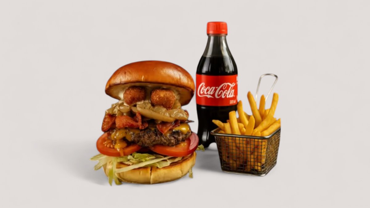 Serveres med pommes frites og en valgfri 0,5 l sodavand.