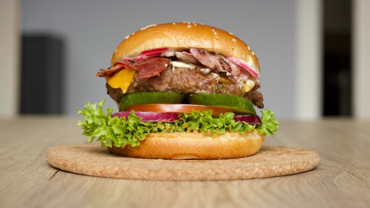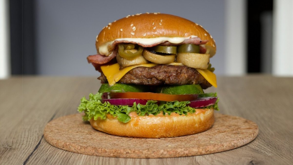 Burgerbolle med fyld af oksebøf, kalvebacon, cheddarost, stegt champignon, rødløg, tomat, salat, agurk, mayo og hjemmelavet dressing.