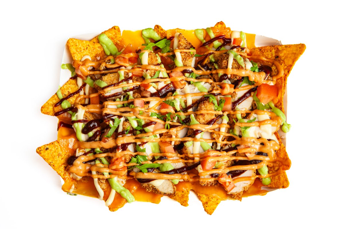 Tortillachips toppet med ostesauce, sprød kylling, tomat, avocado, barbecuesauce, mayonnaise og dressing. Serveres med sodavand og pommes frites.