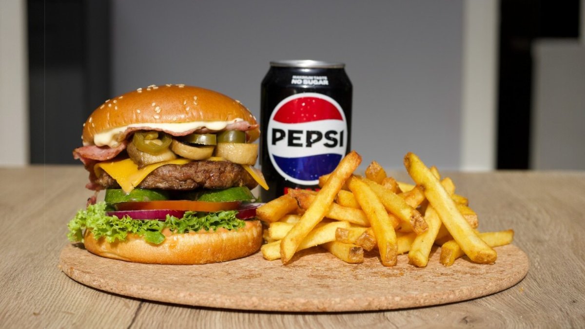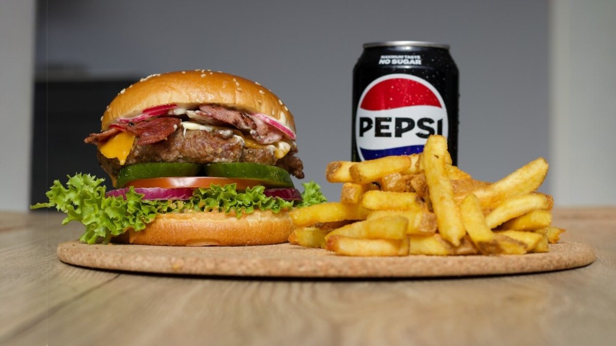 Burgerbolle med fyld af oksebøf, kalvebacon, chili cheese tops, cheddarost, tomat, salat, frisk rødløg, chilli mayo og BBQ sauce. Serveres med pommes frites og én valgfri 0,33 l sodavand.