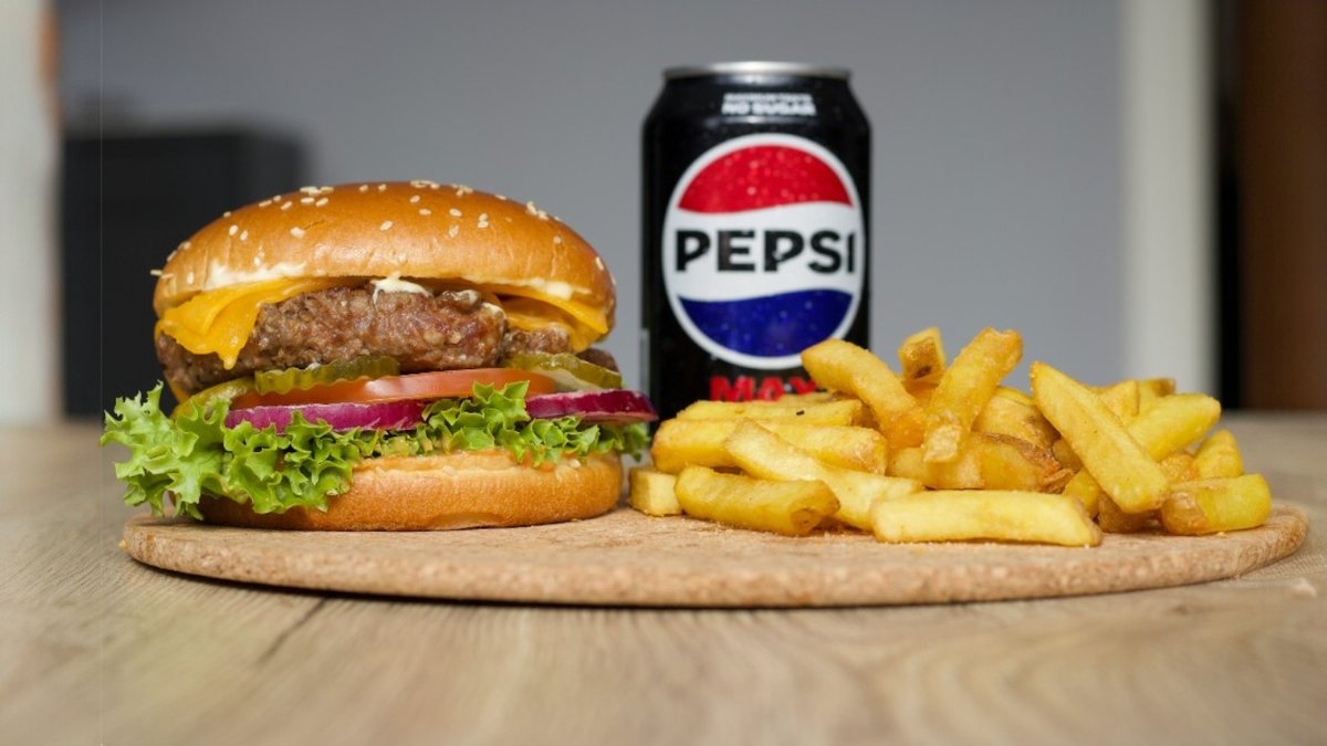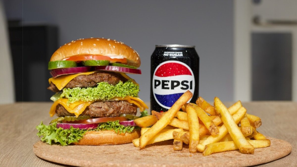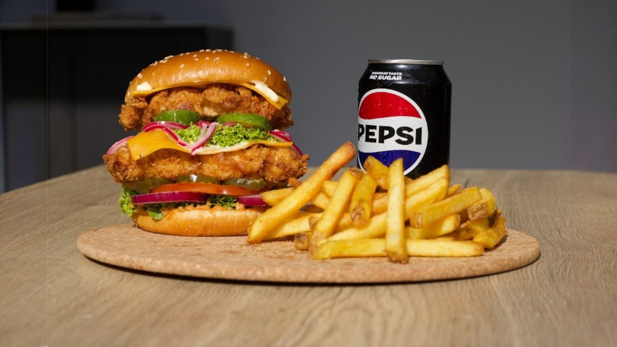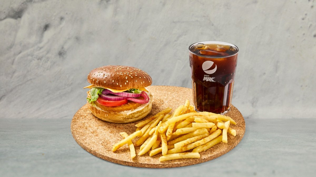 Stegt paneerost, cheddarost, salat, tomat, frisk rødløg, mr, mayo og speciel hjemmelavet dressing. Servert med sodavand og pommes frites.