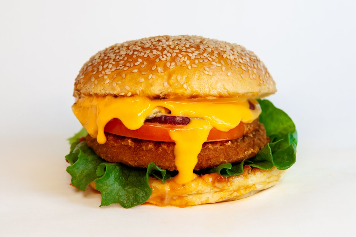 Burgerbolle med fyld af plantebaseret bøf, cheddarost, salat, tomat, rødløg, mayo og hjemmelavet dressing.