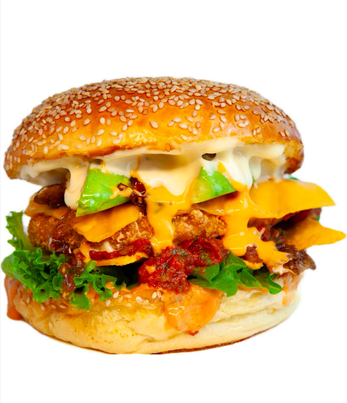 Burgerbolle med fyld af oksebøf, cheddarost, tortillachips, chunky salsa, avocado, salat, agurk, pickles, hvidløgsmayo og speciel hjemmelavet dressing.
