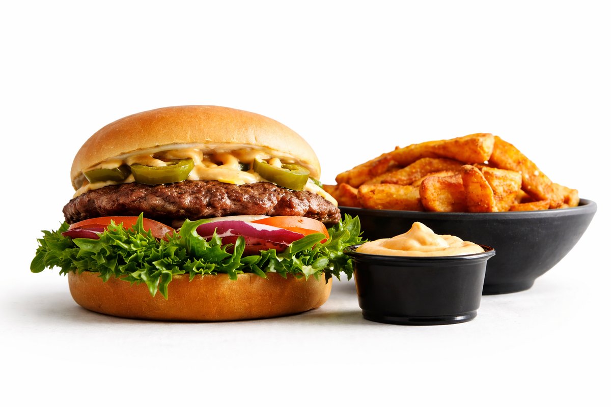 Grillet bøf af 160 gram oksekød, salat, tomat, løg, salatmayo, chilimayo, cheddar og jalapeños. Serveres med kartoffelbåde og chili mayo dip.