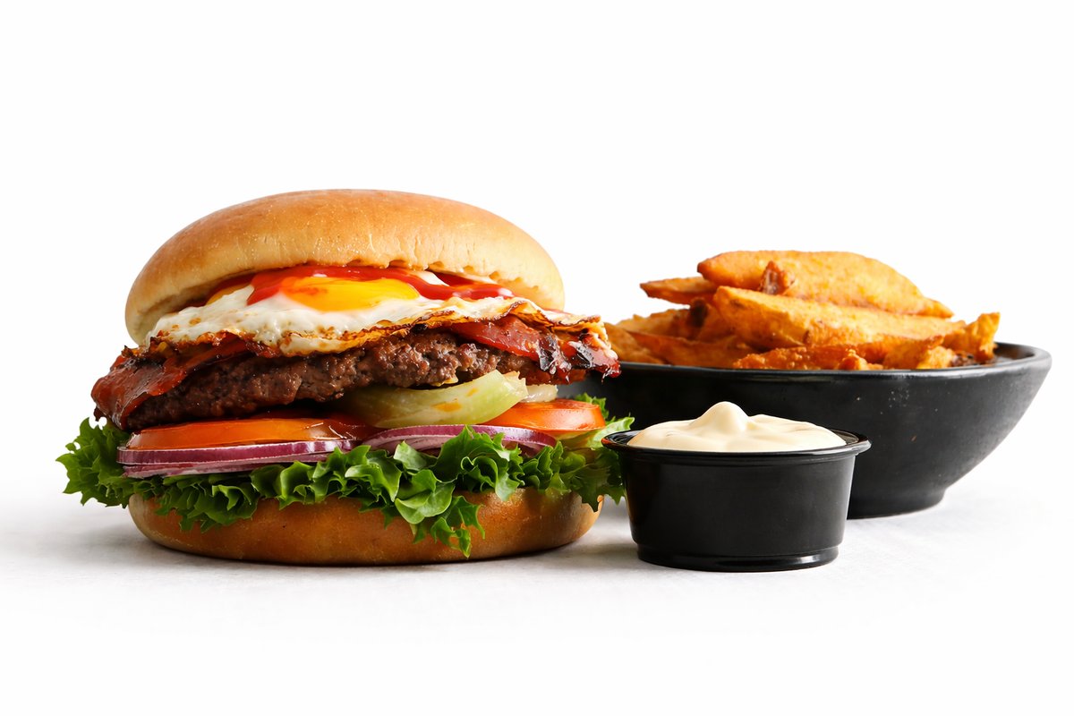 Grillet bøf af 160 gram oksekød, kalvebacon, spejlæg, salat, tomat, løg, salatmayo og ketchup. Serveres med kartoffelbåde og aioli dip.