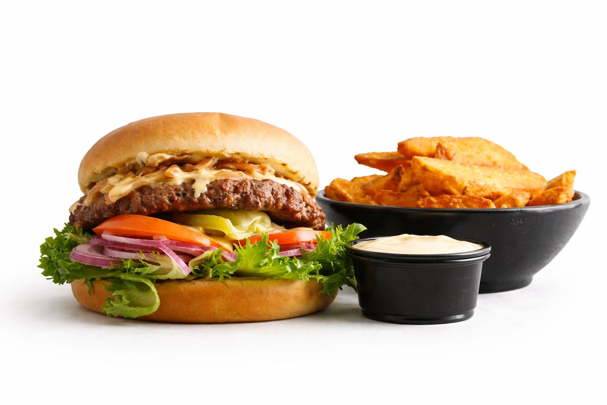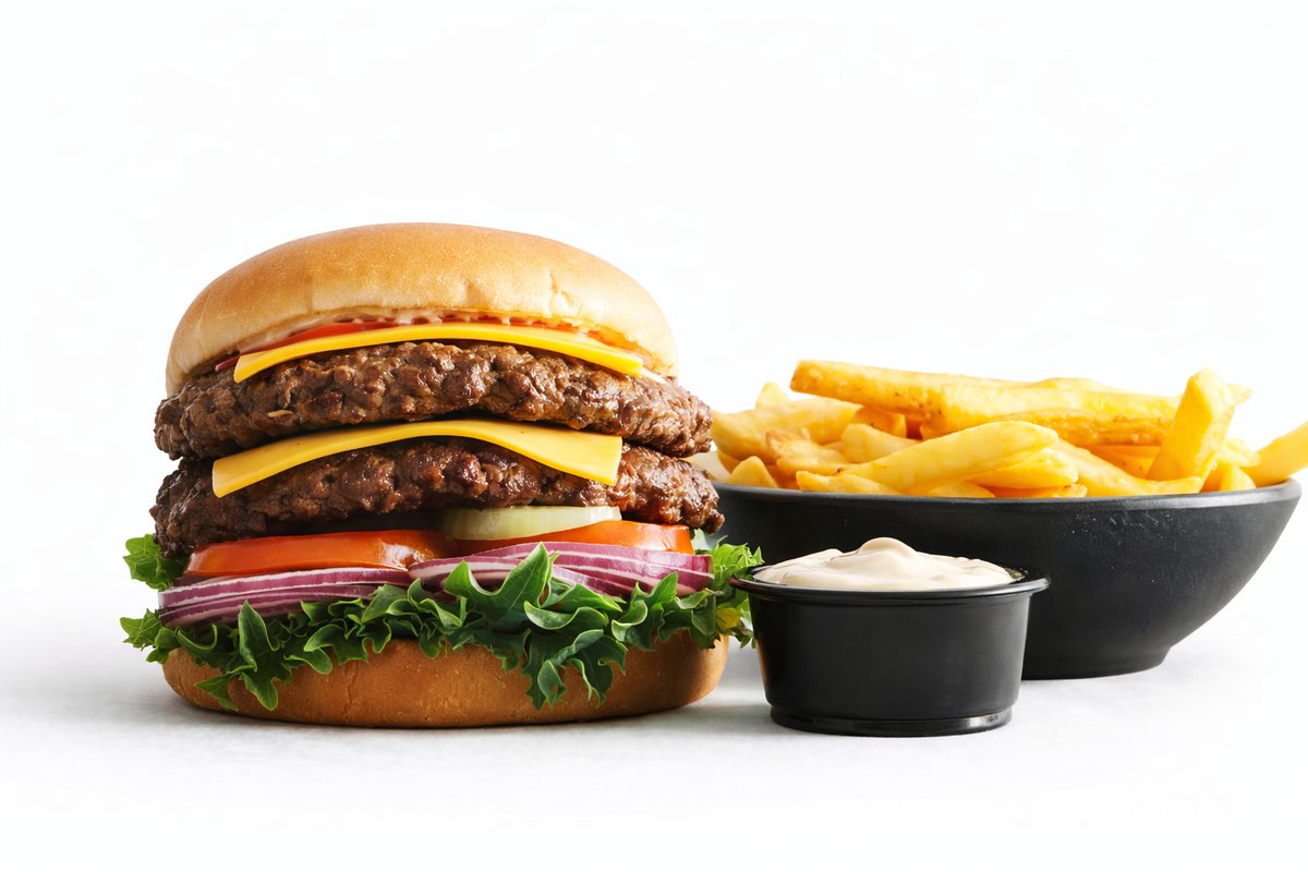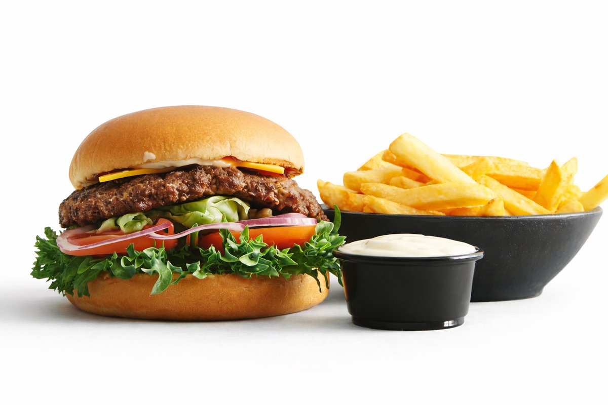 Dobbelt grillet bøf af 160 gram oksekød, cheddar, salat, tomat, løg, salatmayo og ketchup. Serveres med pommes frites og trøffelmayo dip