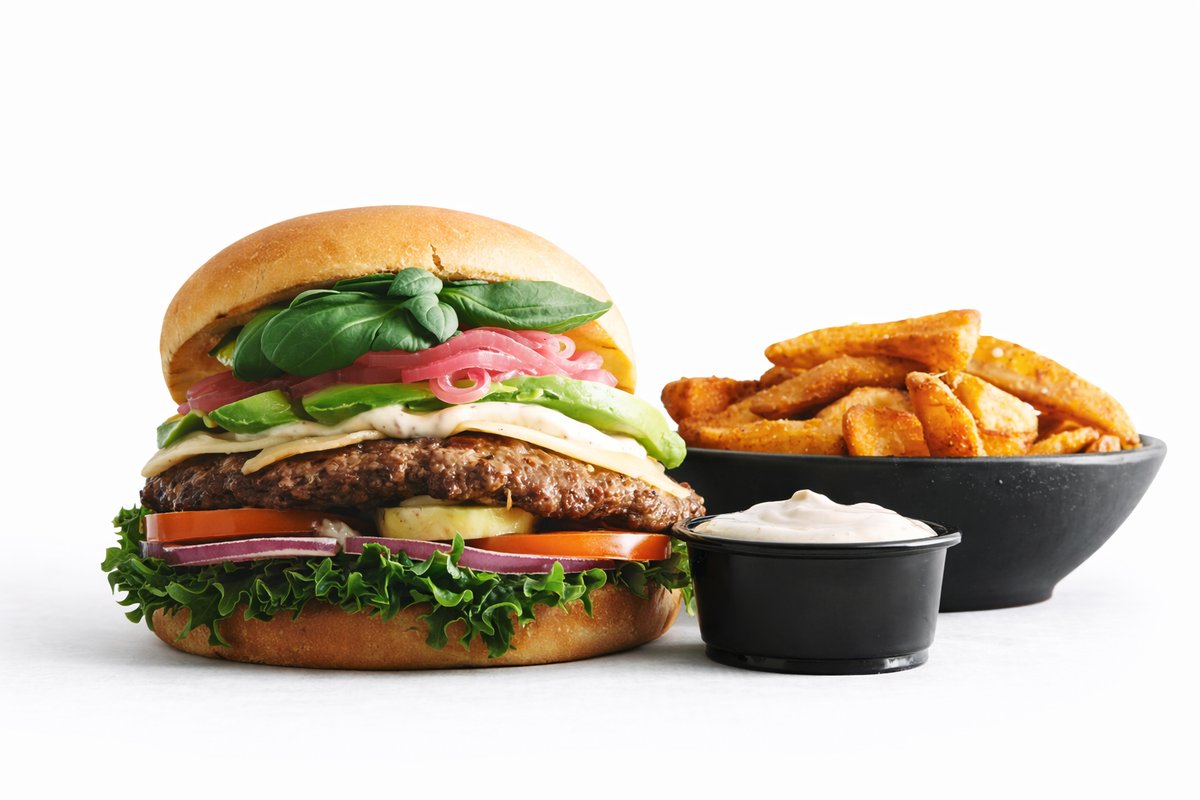 Grillet bøf af 160 gram oksekød, parmesan, trøffelmayo, avocado, hjemmelavede syltede rødløg, salat, tomat, løg og salatmayo. Serveres med kartoffelbåde og trøffelmayo dip.