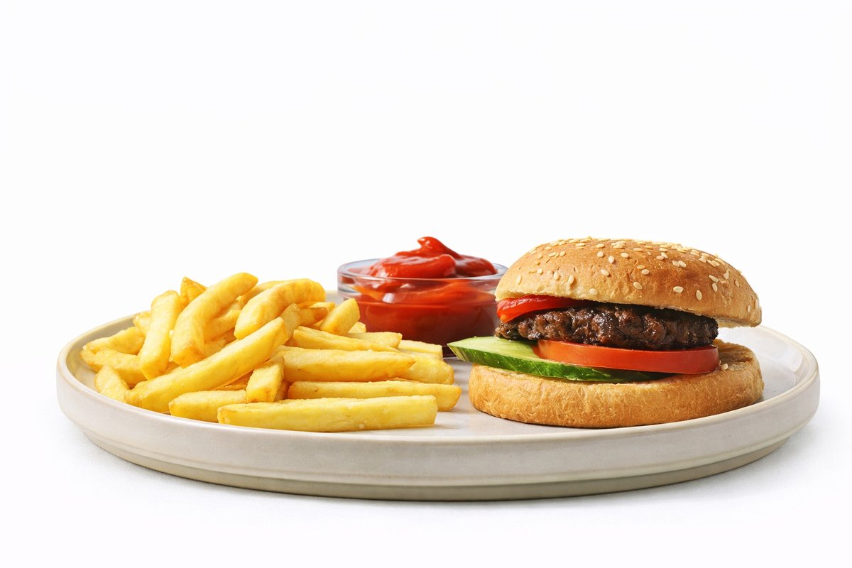 Grillet oksekød, tomat, agurk, ketchup og salatmayo. Serveres med pommes frites , ketchup.