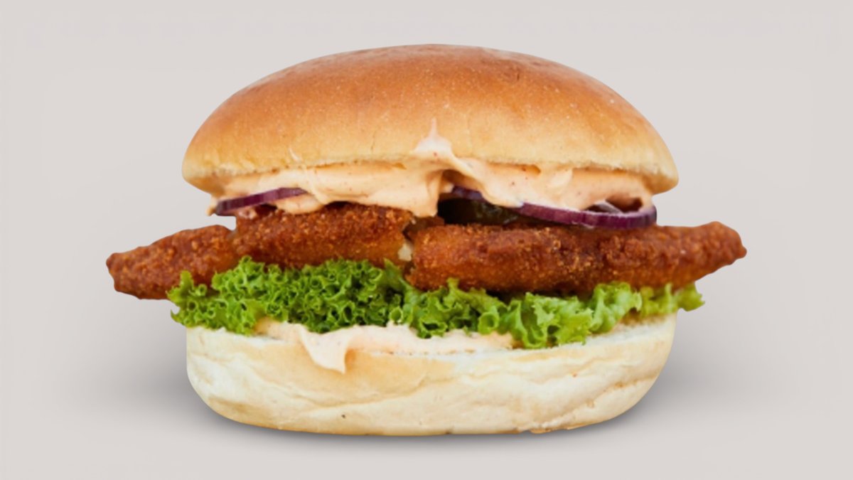 Ristet brioche burgerbolle med southern breaded crispy kyllingbryst, cheder ost, mayonaisse, rødløg, salat, pickles og husets dressing. Serveres med pommes frites, dip og valgfri sodavand.