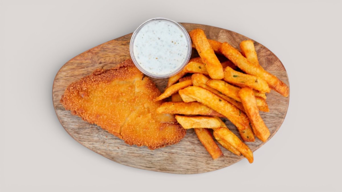 Rødspættefilet og Thick & Crispy Fries severe med tartar sauce.