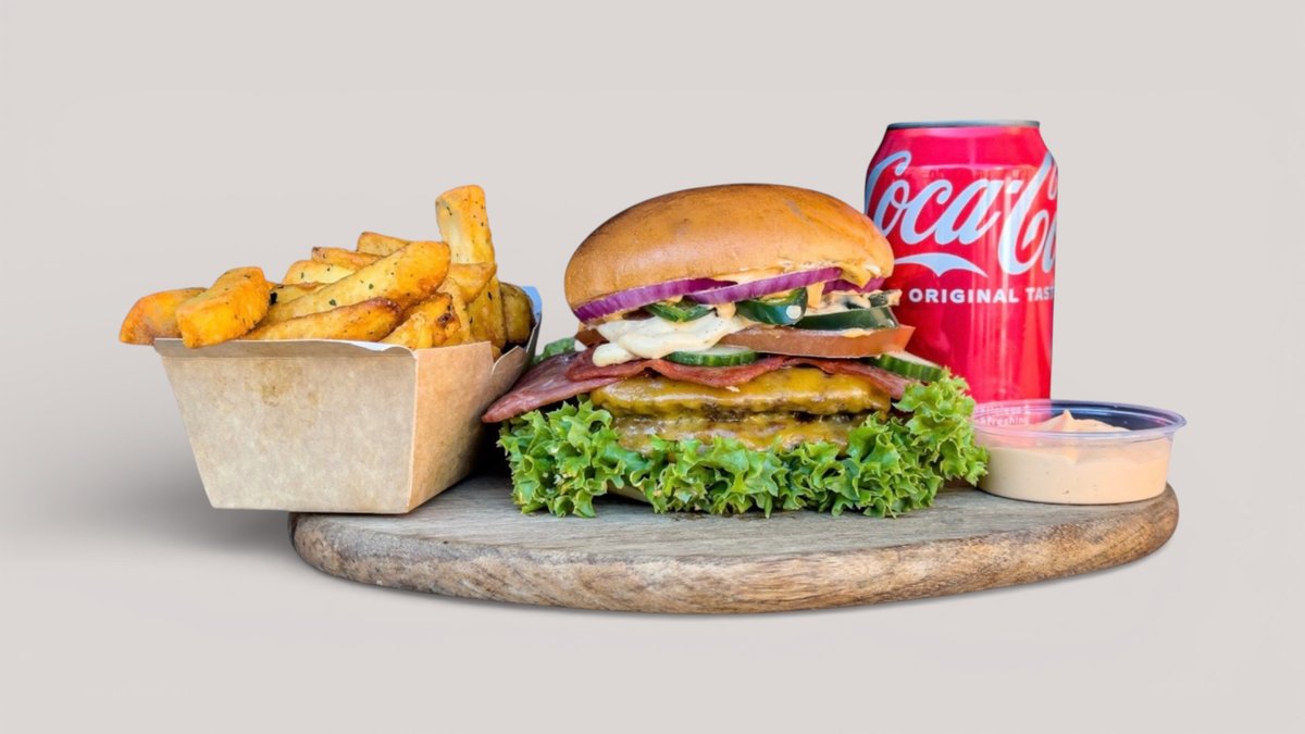 Ristet brioche burgerbolle med 150 gram bøf, kalve bacon, mayonnaise, rødløg, salat, pickles og husets dressing. Serveres med pommes frites, dip og valgfri sodavand.
