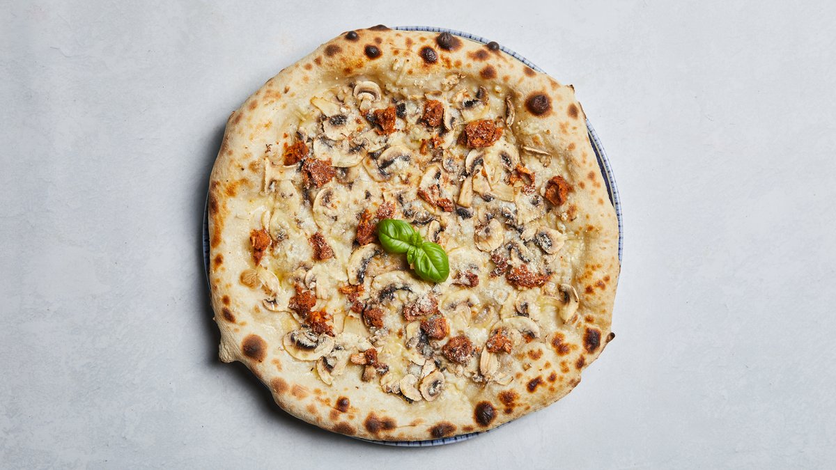 Champignon, Salciccia Vegano, Mozzarella Vegano, Frisk Basilikum, Ekstra Jomfru Olivenolie