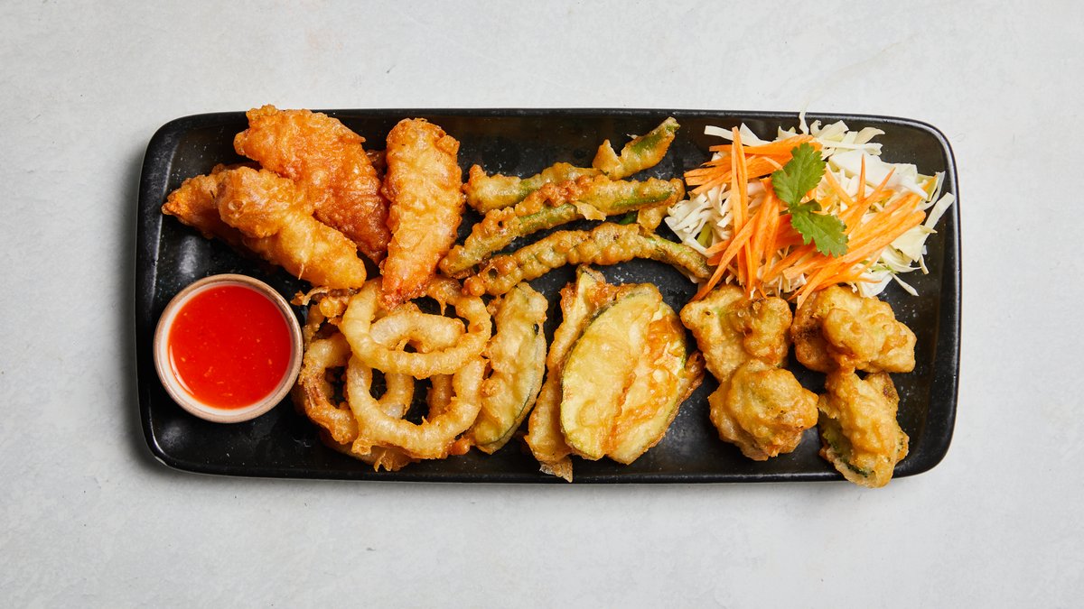 Paneret: Løg (4 stk), Lange bønner (4 stk), Squash (4 Stk), Gulerødder (4 stk), Broccoli (4 stk), Sur/Sød Sauce
