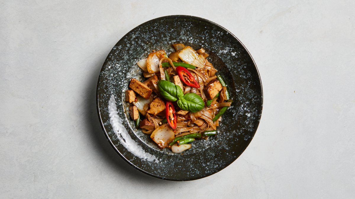 Risnudler, Tofu, Løg, Bønner, Chili, Basilikum