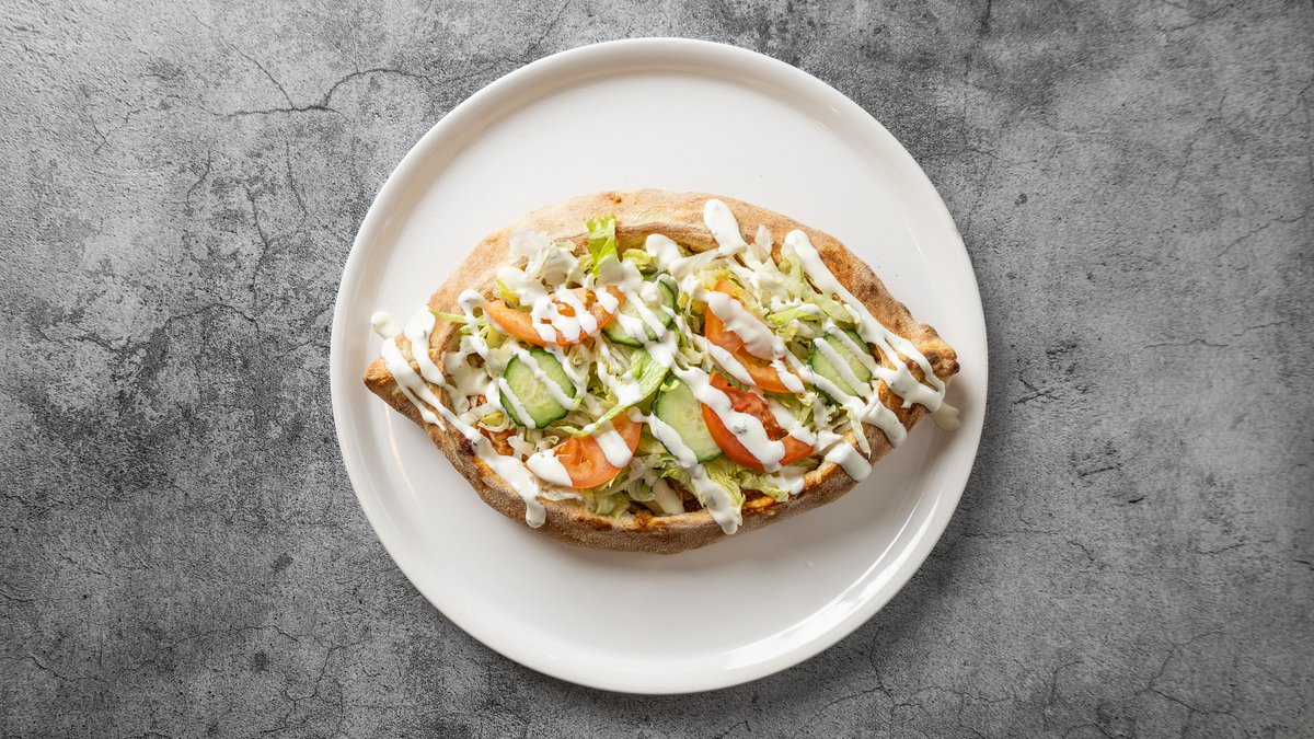 Fladbrød med fyld af valgfri protein, salat, tomat, agurk, løg og dressing.