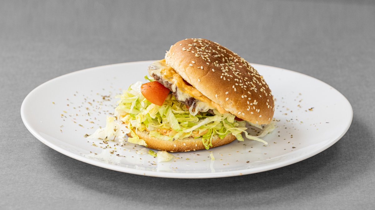 Brioche bolle med mix salat, tomat, agurk. Serveres med pommes frites og mayonnaise.