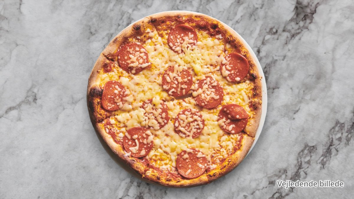 Tomatsauce, ost, pepperoni, cocktailpølser, paprika, løg og bearnaisesauce.
