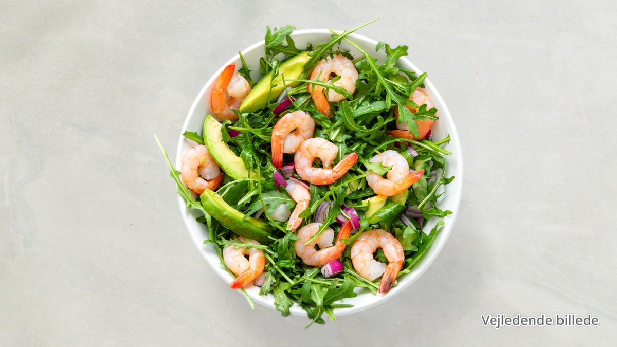 Rejer, mix salat, tomat, agurk, parmesanost, pesto dressing.