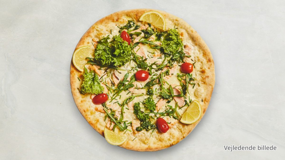 Mascarpone, røget laks, ruccola, cheery tomater og pesto.