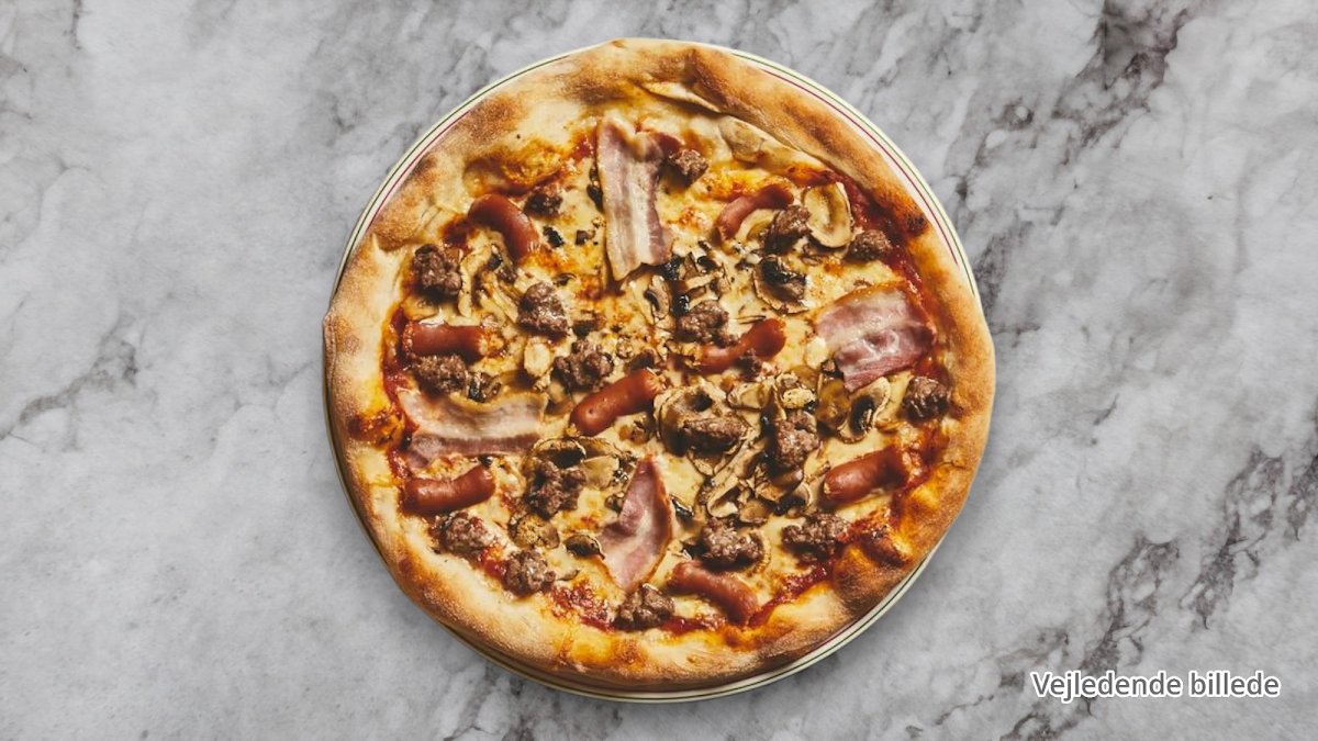 Tomatsauce, ost, oksekød, bacon, cocktailpølser og løg.