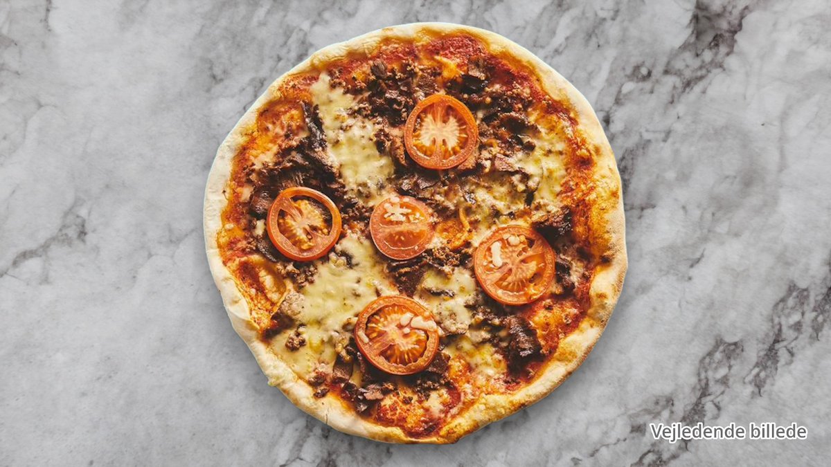 Tomatsauce, ost, kebab, hakket oksekød og dressing.