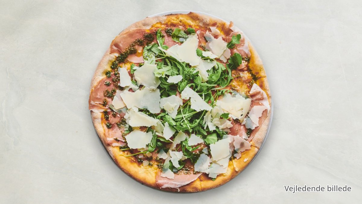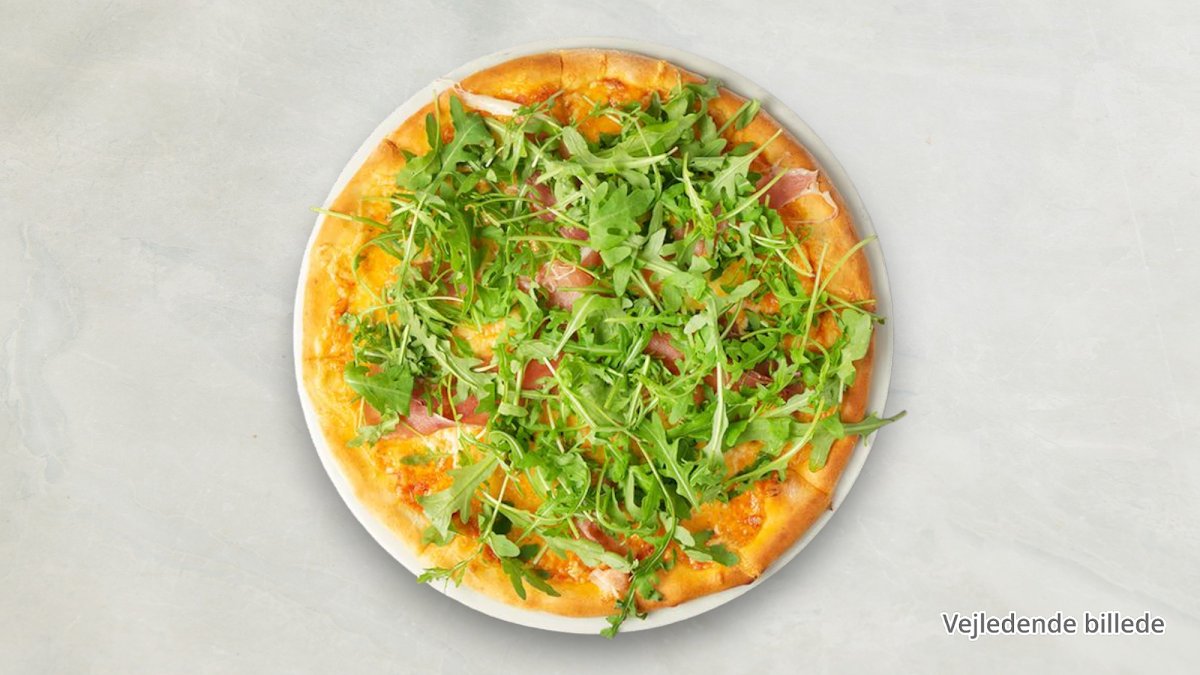 Pizzasauce, ost, agurk, salat, skinke og dressing.