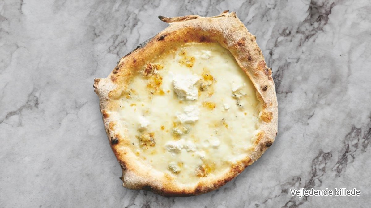 Pizzasauce, ost, champignon, gorgonzola, løg og oksekød.