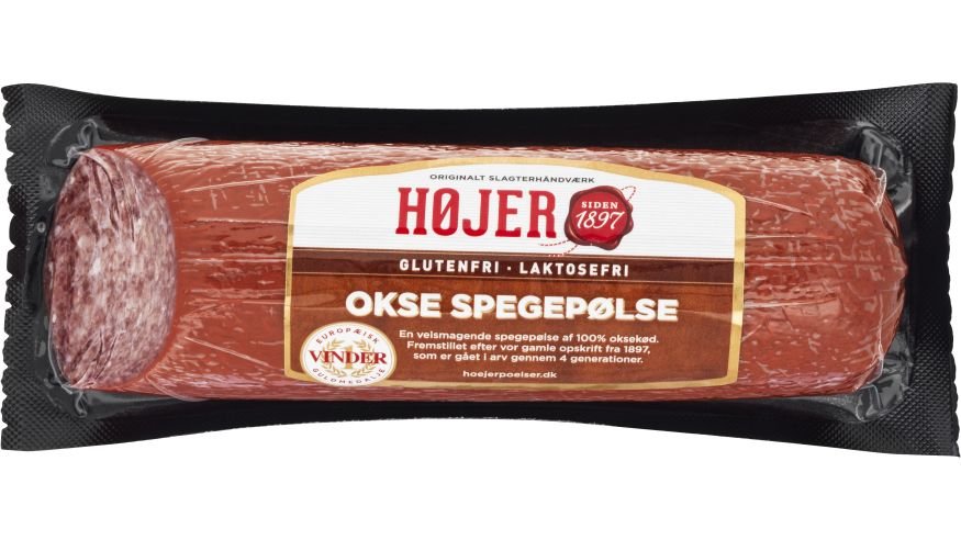 Ingredienser: Svinekød 116g, Oksekød 8g, Salt,Krydderi,Dextrose,Starterkultur. Konserveringsmiddel: E250, Antioxidant: E300, Farve: E120, Røget & Tørret.