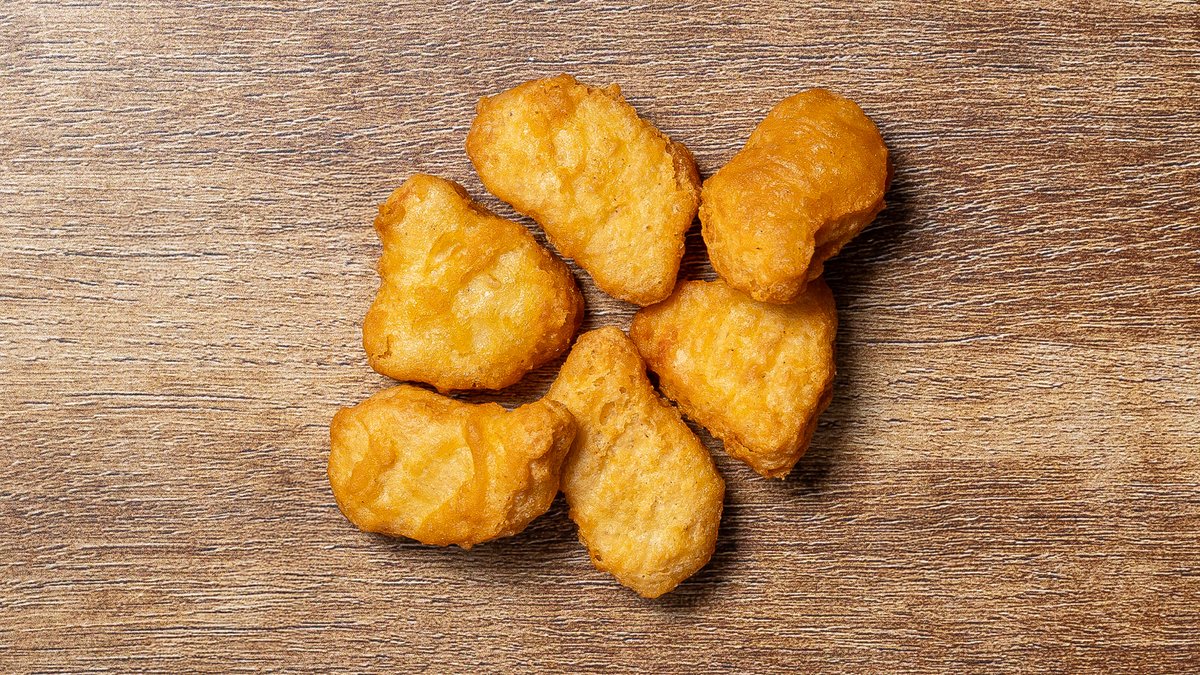 Nuggets serveret med pommes frites, remoulade, citron og en valgfri dåsesodavand.